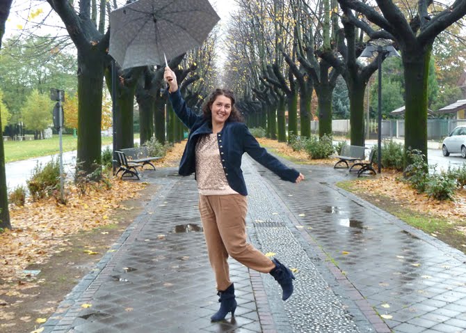 Il pantalone é stato un’altra rivelazione: il tessuto é setoso, morbido e non segna troppo le mie curve. La lunghezza alla caviglia é perfetta sia per indossarlo con degli stivali (come qui, in tinta) o delle ballerine. Adoro poi la combinazione del colore beige con il blu notte ma top e giacca li ho anche abbinati ad una gonna a palloncino marrone (per un look più sofisticato). The trousers was another revelation: the fabric is silky, soft and it does not constrain my curves. The length to the ankle is just perfect to wear it with either boots (like here in the same color) or ballerinas. Then I love the combination of beige with dark blue. I've also combined the top and blazer with a brown balloon skirt for a more sophisticated look.